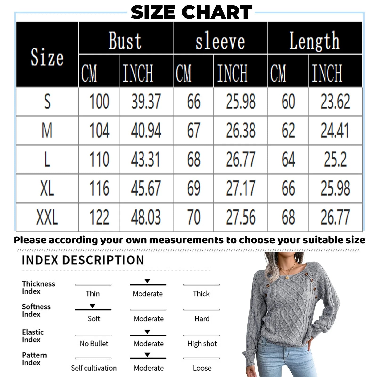 SizeBustsleeveLengthS100cm/39.37''66cm/25.98''60cm/23.62''M104cm/40.94''67cm/26.38''62cm/24.41''L110cm/43.31''68cm/26.77''64cm/25.20''XL116cm/45.67''69cm/27.17''66cm/25.98''XXL122cm/48.03''70cm/27.56''68cm/26.77''